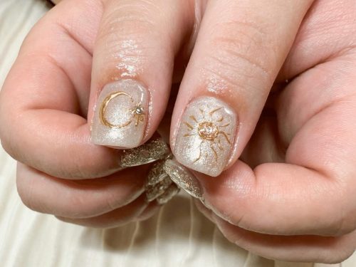 今回のデザインはキラッキラのフラッシュネイルです。 親指には三日月と太陽のアートを入れて、スクエアオフの形で仕上げさせて頂きました。 三日月はほそーく、太陽は周りをニョロニョロながーく お持ち込みいただいた写真のアートに […]