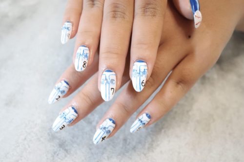 今回のデザインは初夏に合わせて、爽やかなブルー系で。 左右1本ずつアートを入れたデザインです。 右手の人差し指と左手の薬指にアートをいれました。個人的にこの指にアートが入るデザインが好きです♪ アートはシェルを埋め込み、 […]