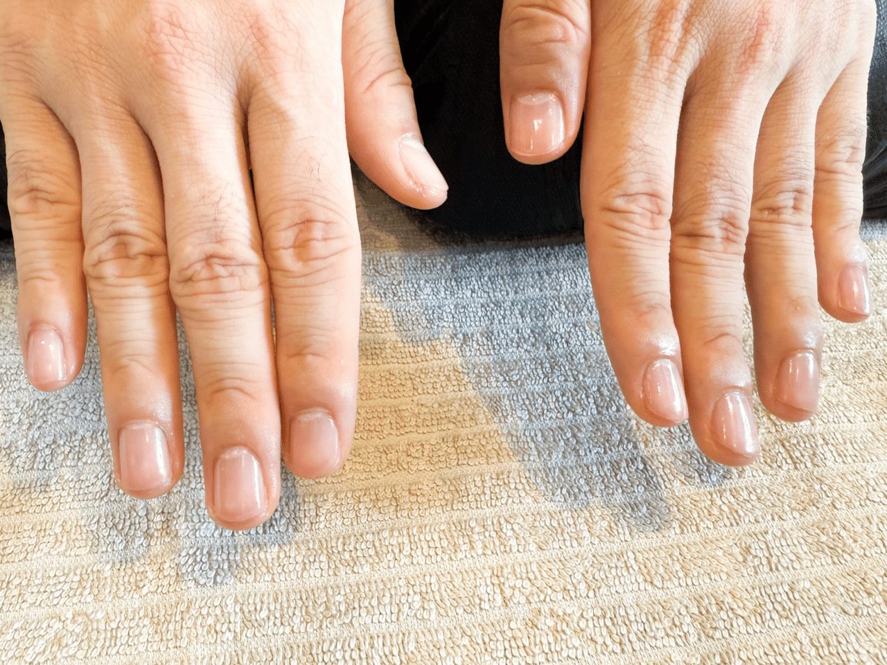 もともととても綺麗な指先でしたが、古い角質や甘皮を丁寧に除去し、ファイルで表面を磨くと…爪は驚くほど艶々に!