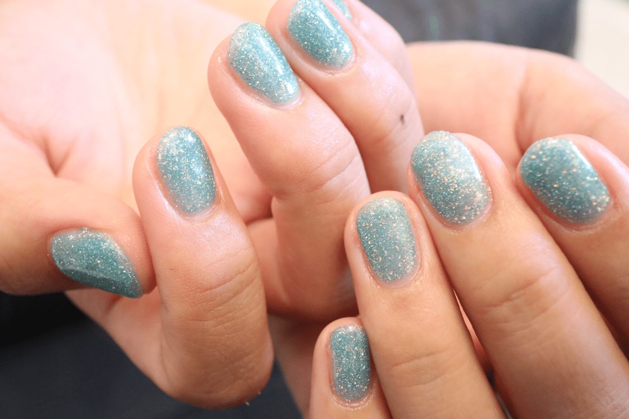 今月は「夏らしいカラーで」とのリクエストをいただき、ブルーのフラッシュネイルをご提案。爽やかなマリンブルーがキラキラ輝き、とてもお似合いでした。