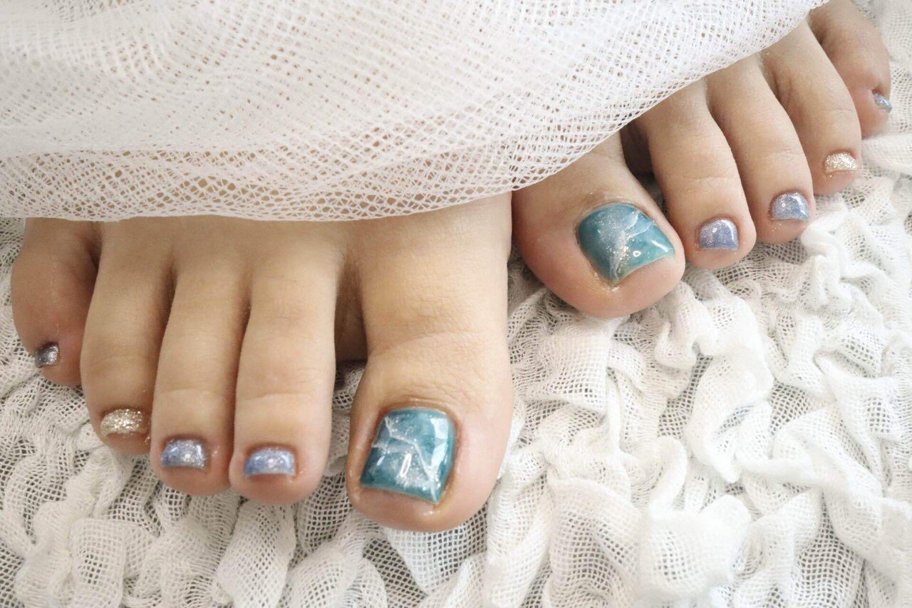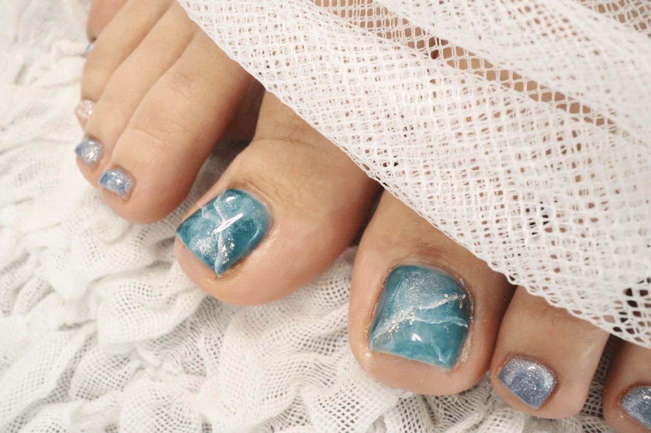 今回のフットネイルは爽やかなブルーの大理石柄です。