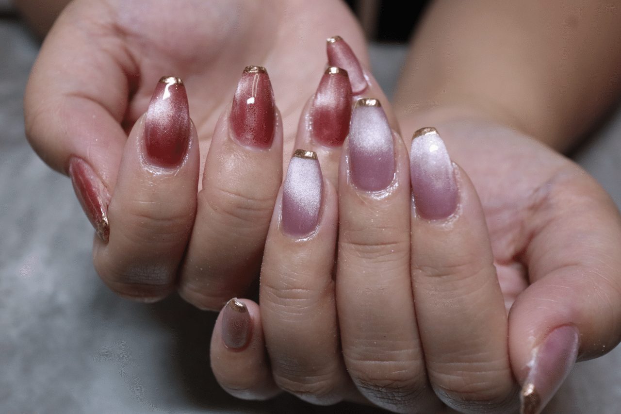 赤とピンクのマグネットネイルをベースに、先端にゴールドのミラーパウダーを施したフレンチデザイン。