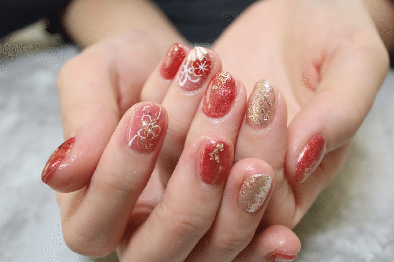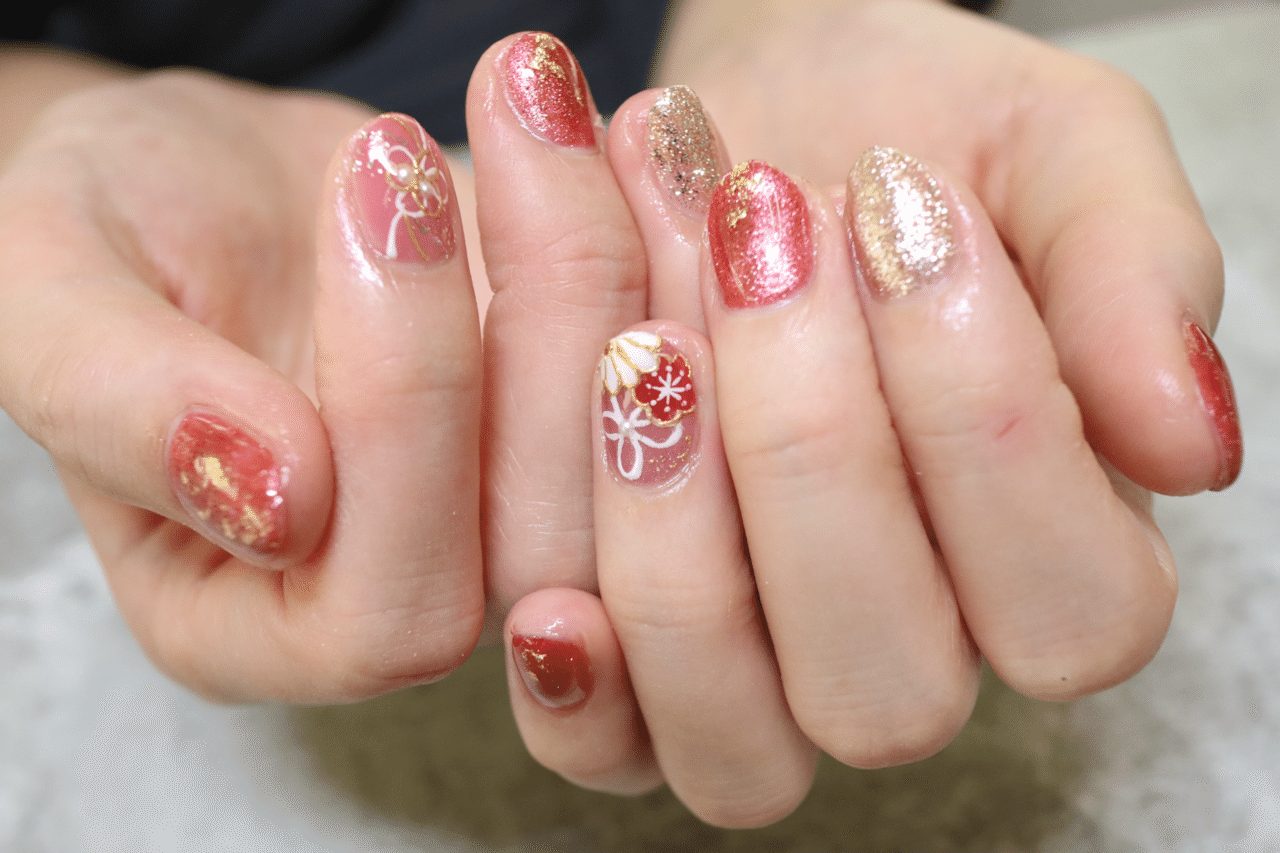 今回のデザインは、菊の花や水引を取り入れた、キラキラと華やかなお正月ネイル。