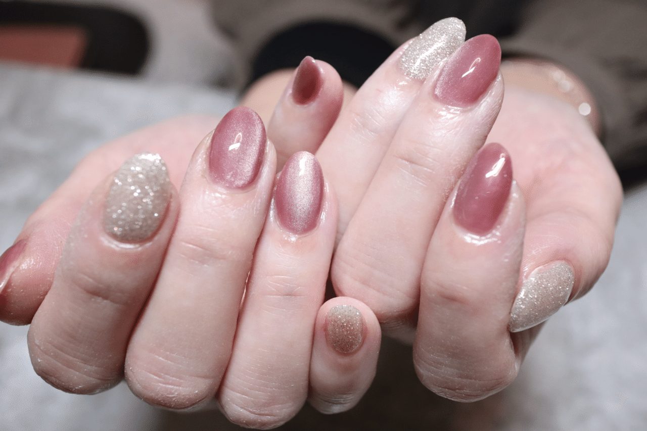 そこで、落ち着きのあるくすみレッドのマグネットジェルをベースに、さりげなく輝きをプラスできるよう、ポイントでシルバーのラメ入りジェルを数本取り入れたデザインをご提案させていただきました。