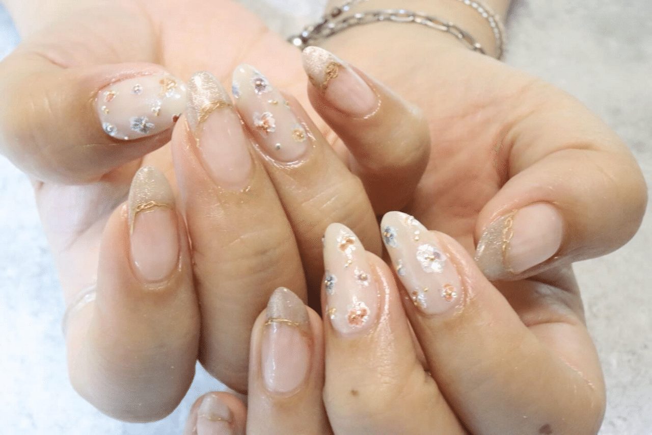 小さなお花が宝石のようにキラキラ輝き、指先に散りばめられた華やかなデザイン。
