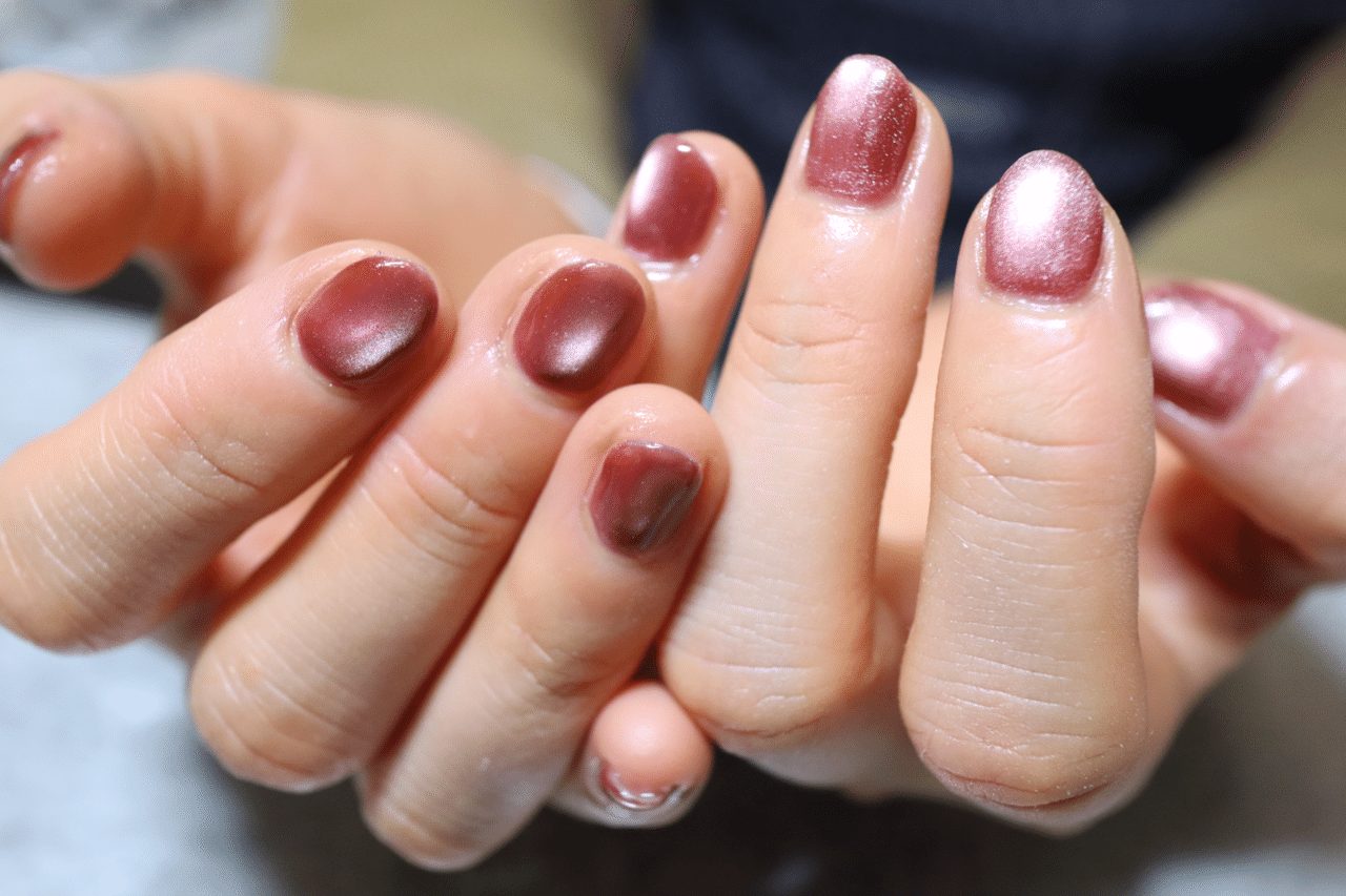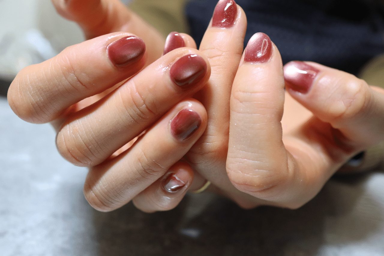 今回のネイルデザインは、赤のマグネットジェルによるワンカラー。
