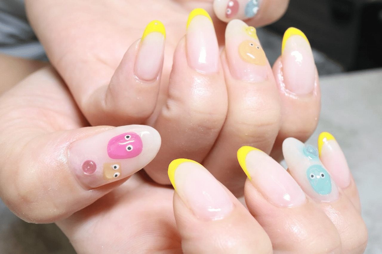 せっかくなので、そのネイルシールを使いつつ、お客様がやりたかった イエローフレンチデザイン と組み合わせることに。さらに、セルフでは難しい立体感のある仕上がりにアレンジして、サロンならではの特別感をプラスしました。